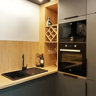 Z otwartej przestrzeni salonu wydzielono kuchnię z pojemną zabudową meblową i przestronnym blatem roboczym. Rozwiązania zapewniają maksymalną wygodę przygotowywania posiłków i utrzymania porządku, jednocześnie harmonijnie wpisując się w całą przestrzeń dzienną.